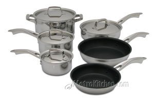 J.A. Henckels International 10 piece Classic Clad Non Stick Cookware Set OverviewsJ.A. Henckels International 10 piece Classic Clad Non-Stick Cookware set provides all the essential pots and pans needed to prepare a delicious meal. Classic Clad cookware is constructed of multi ply clad, stainless steel construction, for even heat distribution and superior cooking performance. The exclusive patented handle design provides the best ergonomics for comfort, optimal control and balance. Fry pans are coated with a durable, nonstick coating for healthier cooking. The flared rim design allows for ease of pouring and optimal strength. Capacity markings on most items allow for ease in measuring ingredients. Code markings on pans and lids makes for easy identification of the correct size lid for each pot or pan. Classic Clad Cookware can be used on all popular cook top surfaces, Electric, Gas, Ceramic, Halogen and Induction.The set includes: 1 Quart Saucepan, 2 Quart Saucepan, 10 Inch Nonstick Fry Pan, 8 Inch Fry Pan, 6 Quart Stockpot and 3 Quart Saute Pan.