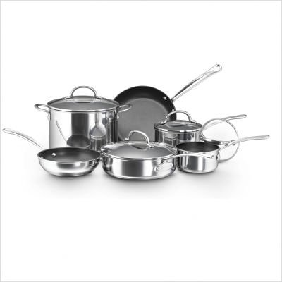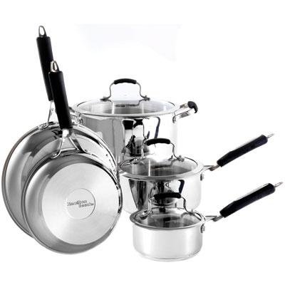 8-inch and 10-inch omelet pans, 1-1/2- and 2-1/2-quart covered saucepans, 8-quart covered stockpot