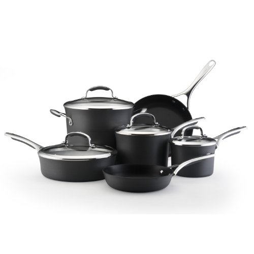 This set has all the pieces necessary for daily family cooking: 8-inch and 10-inch omelet pans, 1-1/2- and 2-1/2-quart covered saucepans, and an 8-quart covered stockpot. The pans’ exteriors are made of hard-anodized aluminum for superior heat distribution. The interiors are coated with a nonstick surface that is resistant to peeling, chipping, flaking, or cracking. This cookware has ergonomic brushed stainless-steel handles that stay cool to the touch on the stovetop and are riveted to the pans for durability. The lids are tempered glass--for viewing food as it cooks--encircled by a stainless-steel band that complements the cookware and fits snugly into the pans. All Contemporary Nonstick cookware is oven-safe up to 450 degrees F, should not be put in the dishwasher, and is covered by a lifetime warranty. --Cristina Vaamonde