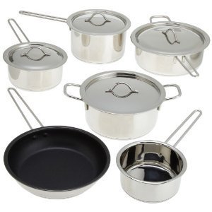 This high-quality, realistic mini stainless steel set offers endless potential for make-believe culinary fun. The classic pots and pans will last through years of energetic play. The 10 piece set includes stock pot and 2 large pots with interchangeable lids, sauce pan, colander, spatula and two pot holders. Items are dishwasher safe. Please wash all pieces thoroughly before use.
