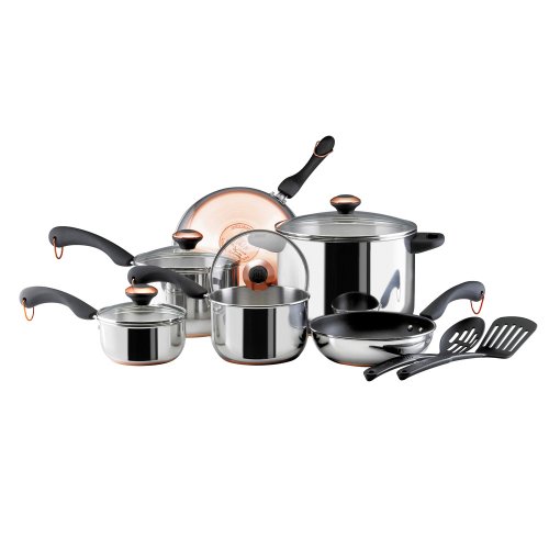 Paula Deens 71925 Signature Stainless Steel 12 pc Cookware Set features a thick aluminum disk base with a full cap of gleaming copper that heats quickly and holds in the heat. The warm sparkle of copper complements the bright radiance of stainless steel. Professional stainless steel construction and a brilliant finish offer durability and long lasting beauty. The stainless steel interior is ideal for all daily cooking needs, providing excellent heat conduction and performance. Rubberized, dual riveted handles are designed to provide a comfortable, secure grip. Stylish copper plated rings are attached for hanging convenience. Tempered glass lid locks in flavors and lets you watch your food cook without lifting the lid. The copper plated knob adds a punch of color and sophistication to spice up your kitchen. This set includes 1 qt covered saucepan, 2 qt covered saucepan, 3 qt covered saucepan, 8 qt covered stockpot, 8 inch nonstick skillet, 10 inch nonstick skillet, slotted turner, and a slotted spoon.